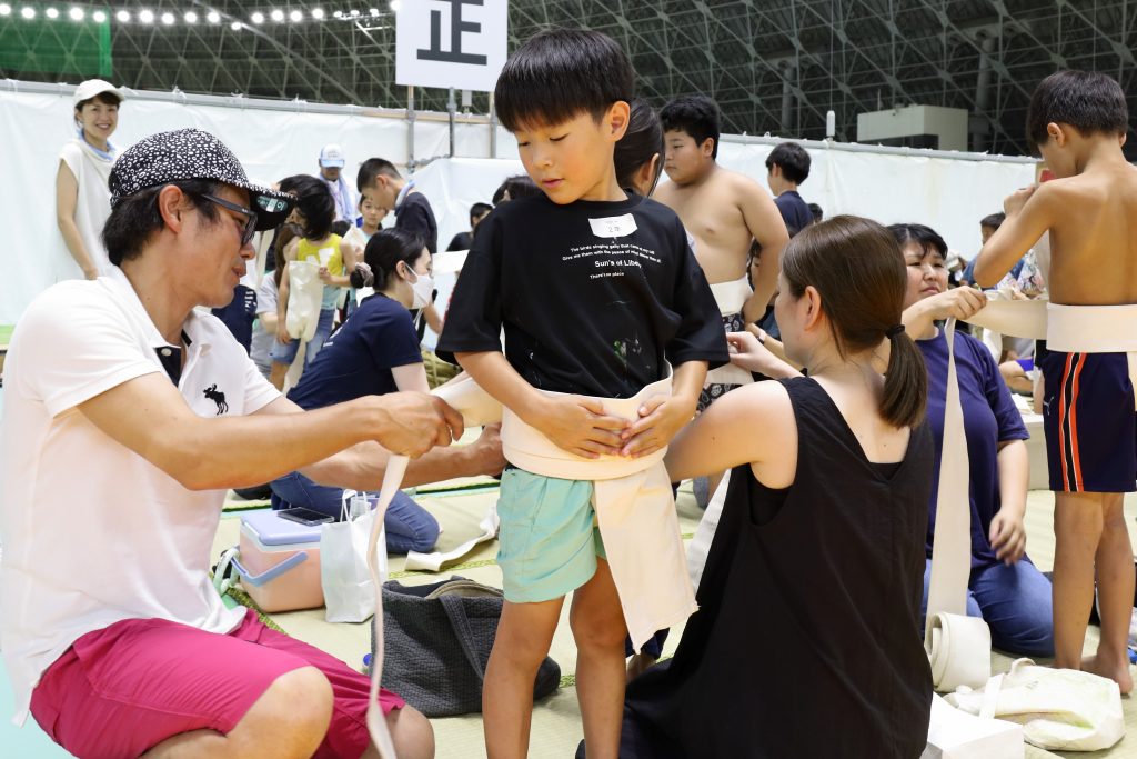 まわしの体験、本格的な土俵の上で四股やすり足、おすもうさんを押そう、記念写真の撮影など(相撲競技の楽しさを実感することができる体験会)