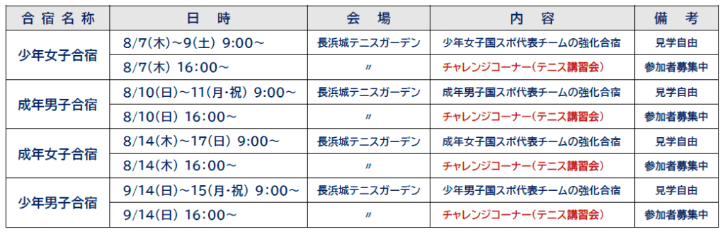 2025年(令和7年)わたSHIGA輝く国スポ・障スポの開催に向けて、本市のスポーツ振興や開催競技の競技力向上を目指し、全国各地の国スポ代表チームが長浜市でソフトテニス合宿を行います。また、合宿期間中、ソフトテニス競技の普及や少年少女の競技力向上を目的としたソフトテニス合宿「チャレンジコーナー」を開催します。