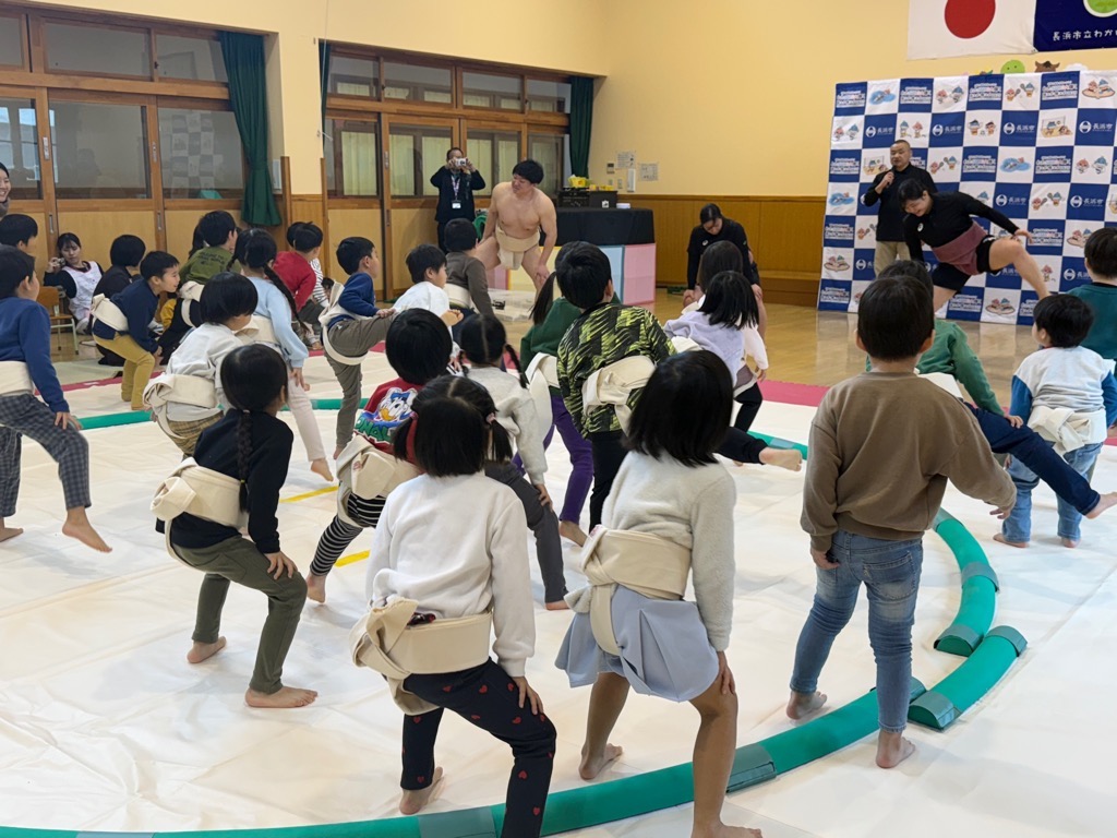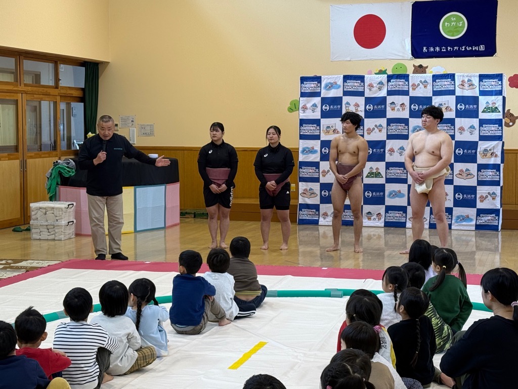 2025年「わたSHIGA輝く国スポ相撲競技会」の開催PRや園児に相撲の楽しさを伝え、競技への興味・関心を高めるため、立命館大学相撲部の部員等がわかば幼稚園を訪問し、園児との交流を行いました。